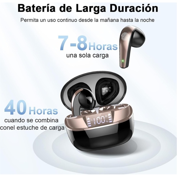 Auriculares Inalambricos Bluetooth, Auriculares Bluetooth 5.3 HiFi Estéreo con HD Mic, 40H Cascos Inalambricos Bluetooth con Pantalla LED, Mini In Ear Auriculares con IP7 Impermeable, Oro Negro