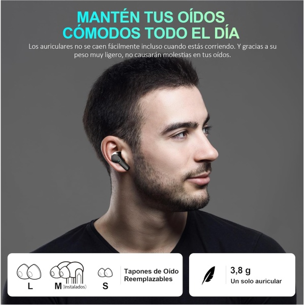 Diseño Ergonómico y Ligero: con 3 tamaños de tapones de silicona suave, estos cascos inalambricos bluetooth ofrecen un ajuste personalizado. Pesando 3,8 g, garantizan comodidad para uso prolongado. Fabricados con nanomateriales ultraligeros, los auriculares inalámbricos resisten el sudor y la lluvia, ideales para el uso diario como caminar, correr y hacer ejercicio.