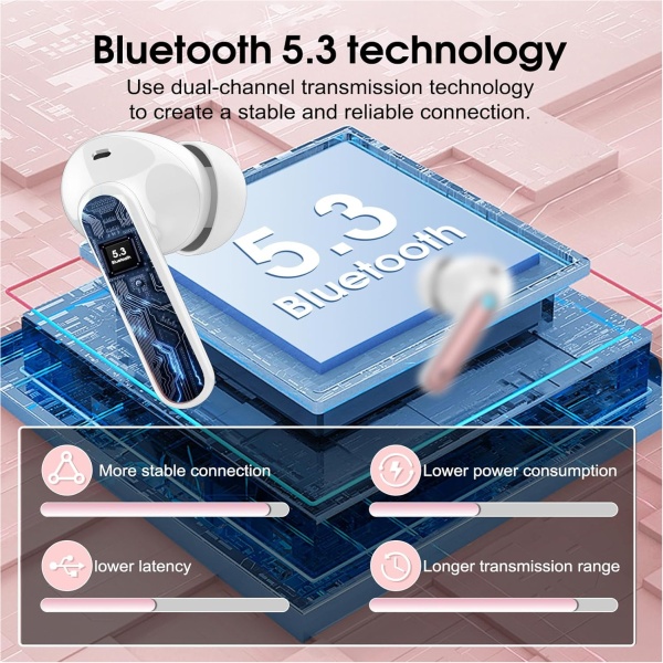 Tecnología Bluetooth 5.3 y Emparejamiento En Un Paso: Los auriculares inalambricos Bluetooth utilizan la avanzada chip Bluetooth 5.3, optimizada específicamente para lograr una señal estable, menor latencia y una conexión más rápida. Incluso si estás en un gimnasio o recinto deportivo ruidoso, podrás disfrutar de una conexión continua y estable. Cuando se abre la caja de carga, los auriculares se conectarán automáticamente al último dispositivo emparejado y se asociarán. (Tecnología Hall).