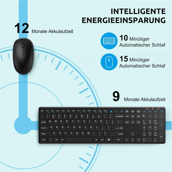 Juego de teclado y ratón inalámbrico, QCen 2,4 GHz, ultrafino, teclado inalámbrico ergonómico en tamaño estándar con 19 teclas especiales y un teclado numérico, para PC, portátil, disposición alemana