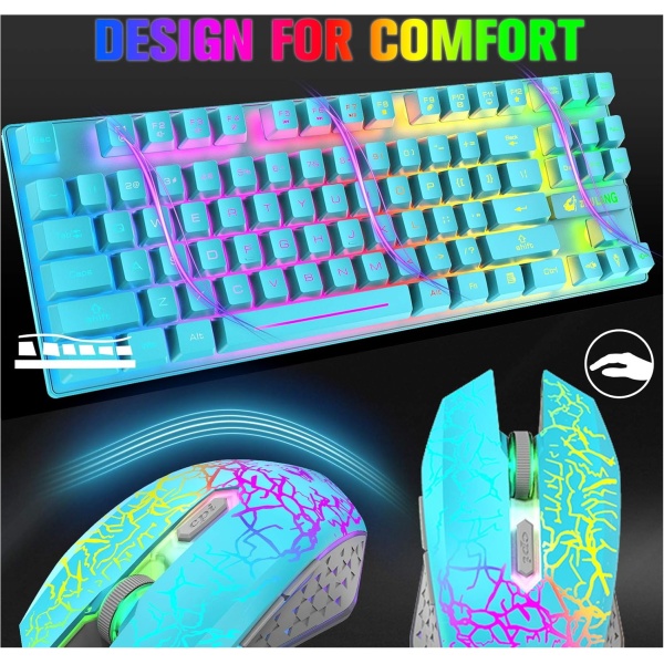 LexonElec Combinación de ratón y teclado inalámbrico para juegos, 87 teclas arcoíris retroiluminación LED batería recargable de 3800 mAh sensación mecánica ratón mudo impermeable RGB (azul)