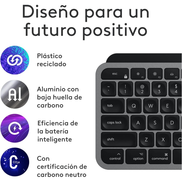 Plástico reciclado: las piezas de plástico de MX Keys S Combo for Mac incluyen plástico reciclado posconsumo con certificación; 27 % para MX Master 3S for Mac y 26 % para MX Keys S for Mac (8)