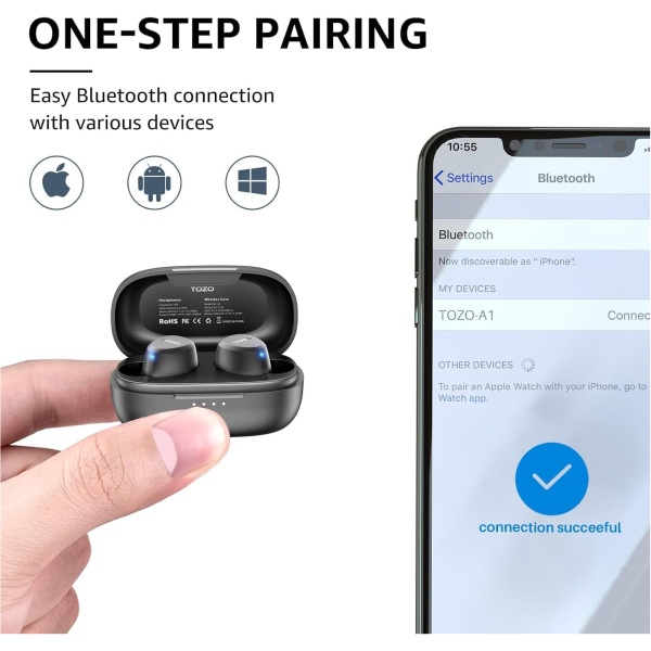 Coge 2 auriculares del estuche de carga y se conectarán automáticamente. A continuación, en un solo paso, entra fácilmente en la configuración Bluetooth del teléfono móvil y elige «TOZO-A1» para emparejar los auriculares.